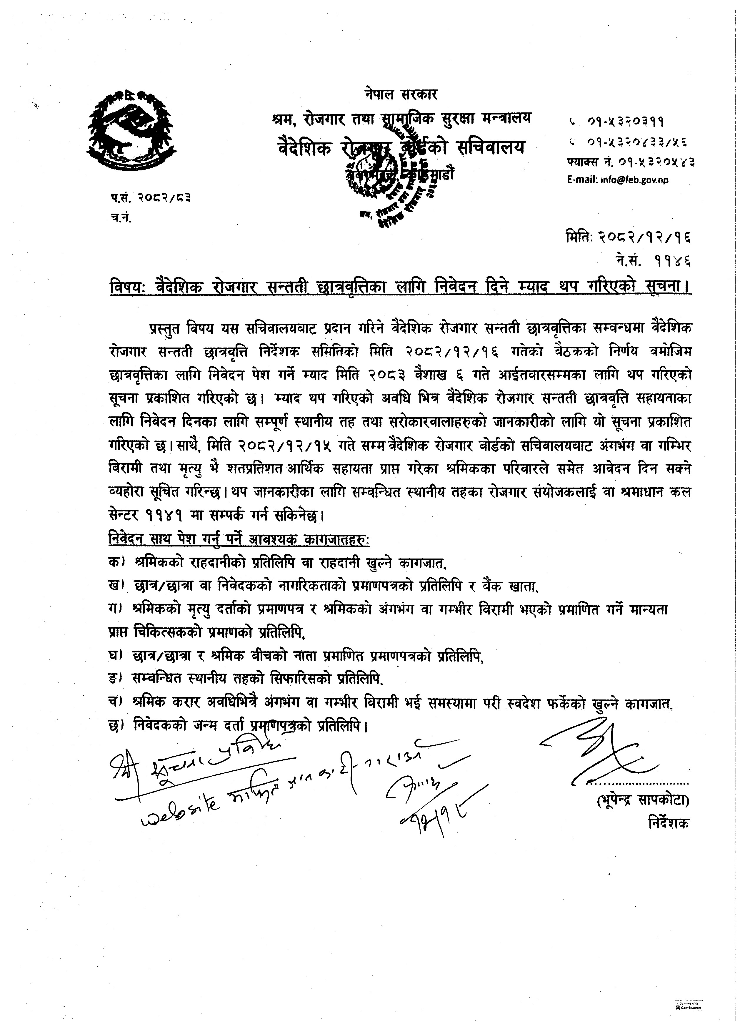 वैदेशिक रोजगार सन्तती छात्रवृत्तिका लागि निवेदन दिने म्याद थप गरिएको सूचना।