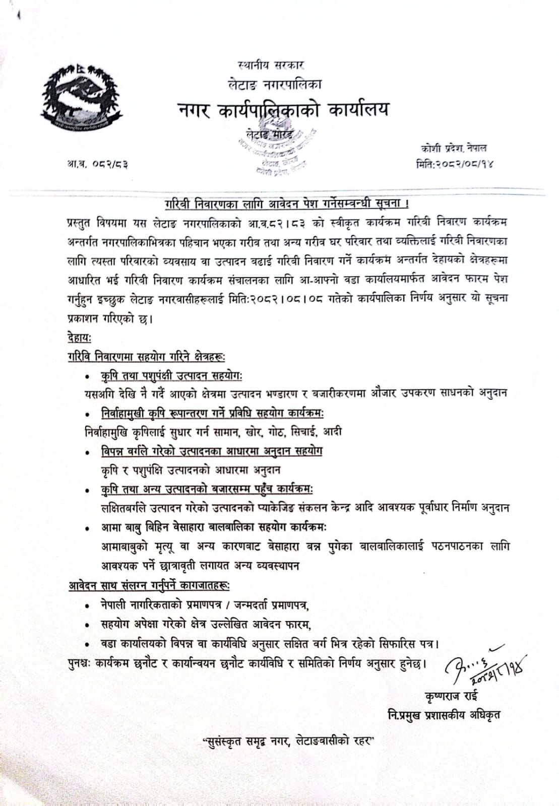 गरिवी निवारणका लागि आवेदन पेश गर्नेसम्वन्धी सूचना । (प्रकाशन मितिः२०८२।०८।१४)
