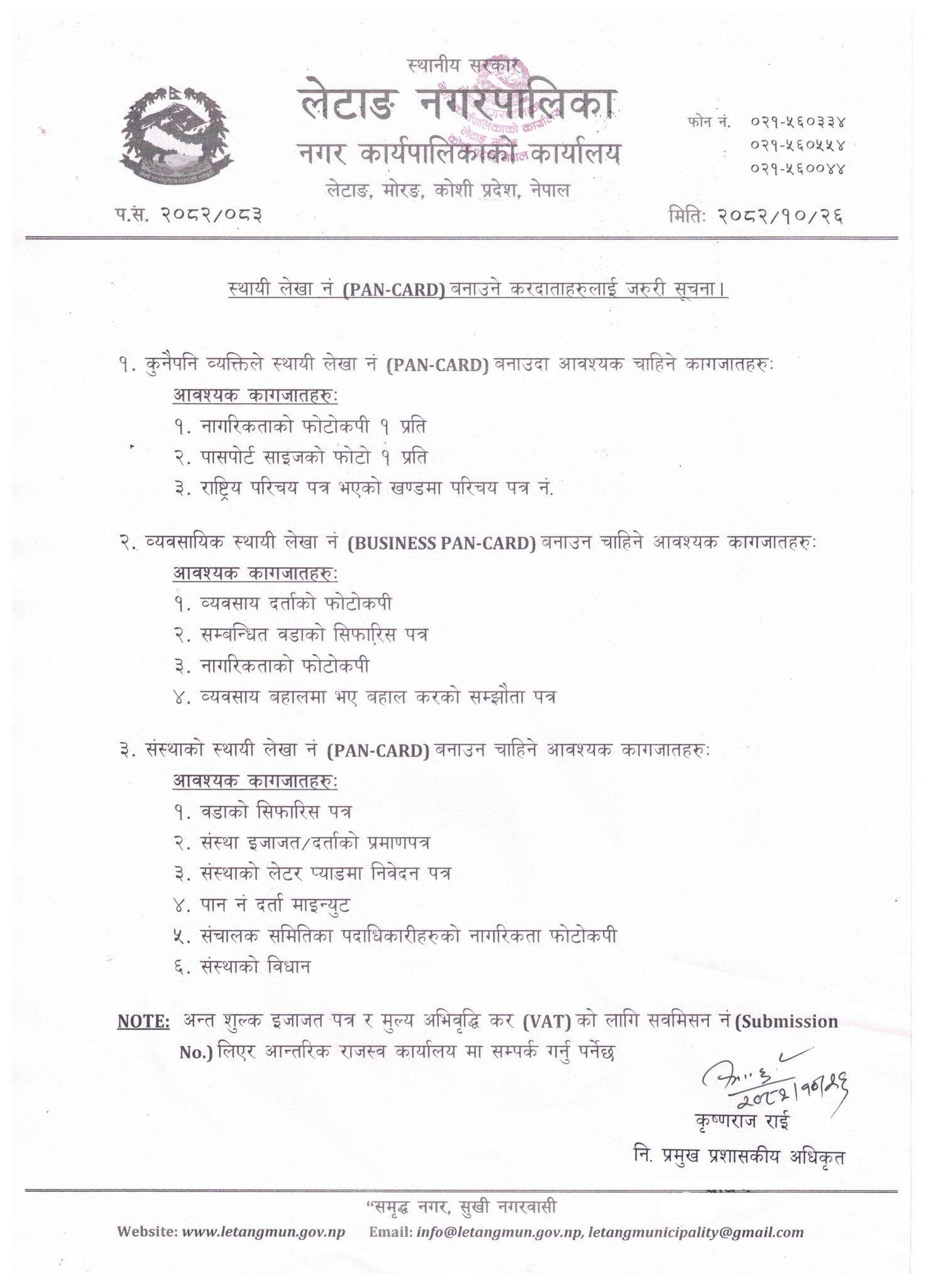 स्थायी लेखा नं (PAN-CARD) बनाउने करदाताहरुलाई जरुरी सूचना।