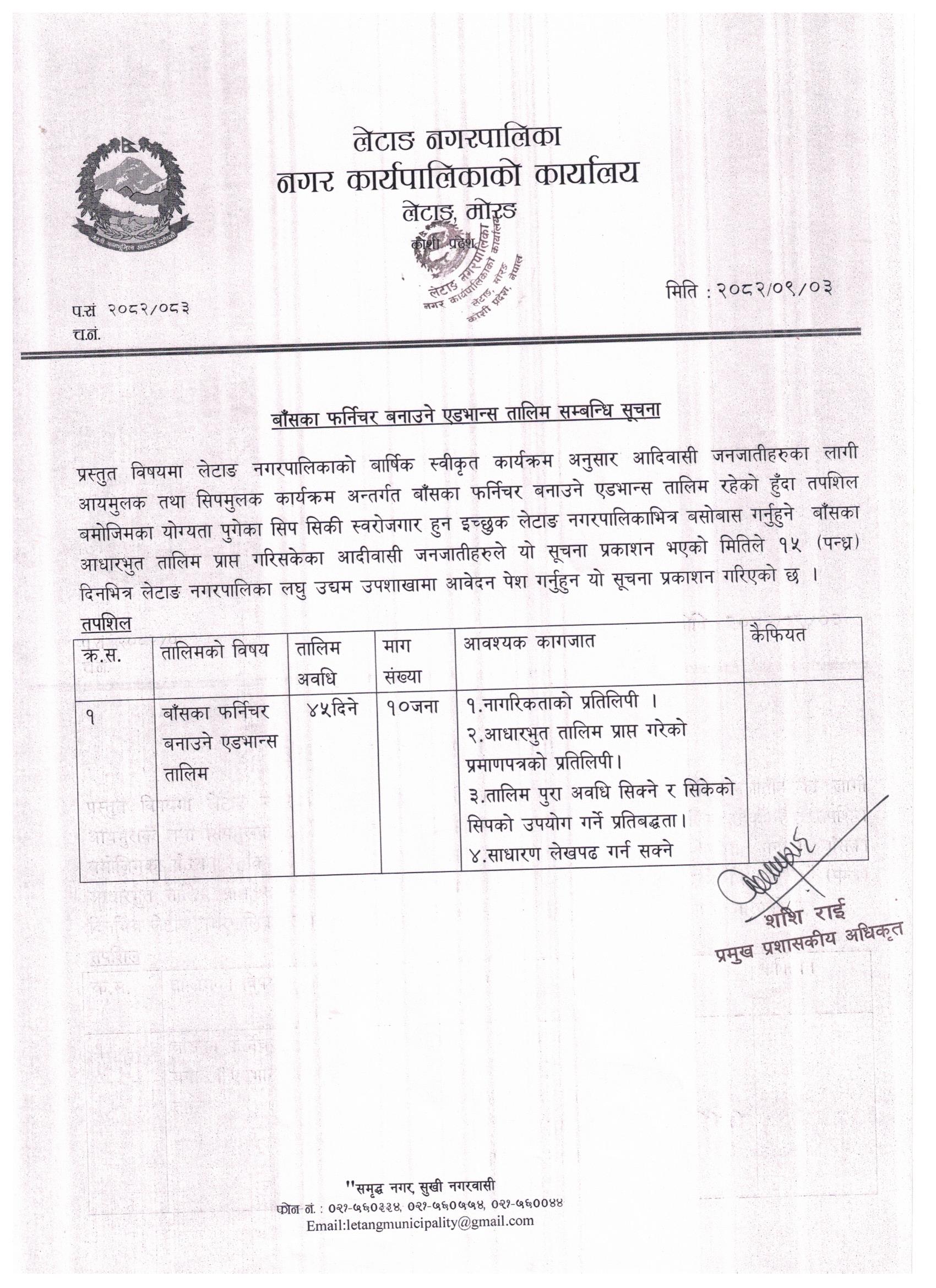 बाँसका फर्निचर बनाउने एसभान्स तालिम सम्बन्धी सूचना। सूचना प्रकाशन मितिः २०८२।०९।०३